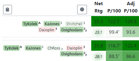 Again, this isn’t me assigning my pro Rossy Possy agenda, this is the numbers speaking loud and clear. You need to be able to dip into your bench for more than token or foul-forced minutes. The bench does have skills that help the team individually. Oso + Gold is still the answer to rebounding woes. Sean is still basically the only way Kolek gets spot up looks. They have a role.