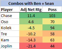 But not anyone can play with not All-America-level players and also elevate them. And through the first third of this season, Chase really has. Here are the Hoop-Explorer stats with Sean and Ben and the player listed, filtering out garbage minutes and adjusting for opponent quality, with a minimum of 40 possessions played.