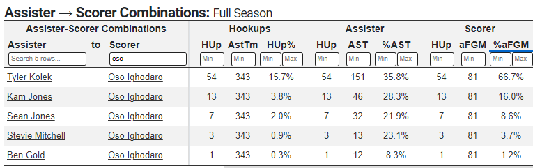 Kolek has assisted on 25 total Oso dunks this season, which makes up 58% of Oso’s total dunks, per Synergy’s tracking. They are easily on pace to surpass last season’s total of 30 from last season.