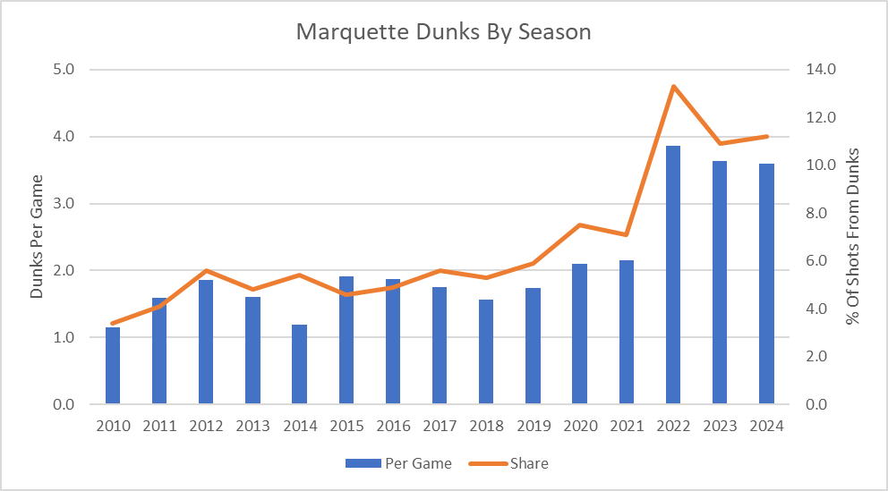 And speaking of dunks, despite losing its 2nd most prolific dunker in OMax, Marquette is keeping pace with last year’s dunk rates, mostly due to Oso’s dominance. He currently has more dunks (43) this season than any single season from any non-Oso player since 2010, per barttorvik.com.
