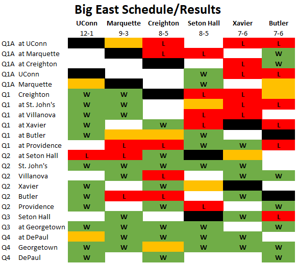 I’ve posted a Big East schedule and result map below, to help guide what games each teams have left, sorted by their NET quadrant positioning. After this week, both UConn and Marquette will only have 3 Q1 games left.