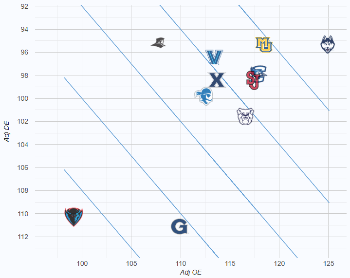 I still love my OG TRank charts. This one measures the adjusted offensive and defensive efficiency (taking pace out of the equation) and adds in the lines based on national trends. Even though Marquette is clearly the 2nd best team in the league, you can visually see the gap between them and UConn is larger than that of any team behind them, to date.