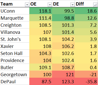 Similar to TRank, this KenPom efficiency margin chart removes pace, but doesn’t adjust for opponents, since it is just measuring Big East play. Again, the gap between 1 and 2 is wider than the gap between 2 and 3.