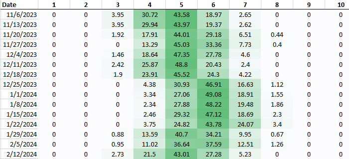Collecting these weekly also gives us a great visual to see the rise and fall. Like take Villanova. There were projected to be the 4th best team in the league, in a 2nd tier behind the top 3. And although they are in a 2nd tier behind the top-30, they have fallen over 40 spots from where they were in the 4th week of ratings.