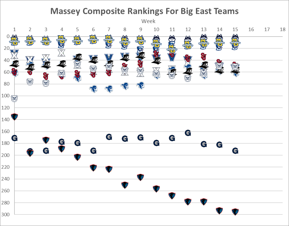 You may also be asking, why are there only 9 teams? Because adding in Georgetown and DePaul makes it a useless chart.