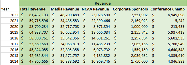 The biggest source of revenue for the conference, that ultimately gets passed along to the individual programs, is media revenue, primarily from the FOX contract signed way back in 2013. Last season, that amounted to nearly $50M, a significant jump due to having a full set of game inventory for the first time since 2019. (More on that here.)