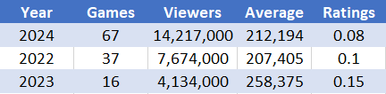 My source for ratings changed from Showbuzz Daily to Sports Media Watch, which allowed us to see not just those telecasts over 200K (like in 2022) or in the top-100 of a given day’s telecasts (like in 2023) and thus provided a full accounting of every Big East game, which will increase the total and dampen the average. Just a background as to why there are so different