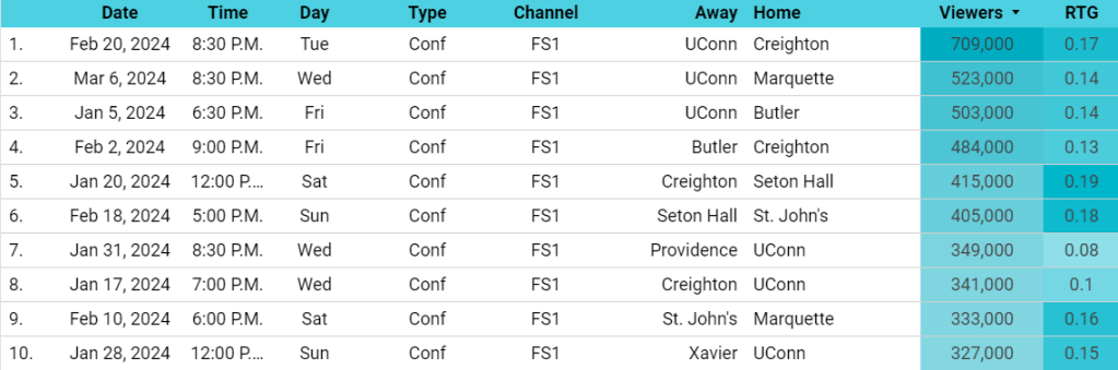 As you can see, there was a remarkable improvement in this area, jumping over 46% for the average of the top 10 games from 2023, and 55% from 2022. And even though the 709K for Creighton vs UConn was a regular season record on FS1 for the Big East, it wasn’t just one outlier tipping the scales and messing with the average.