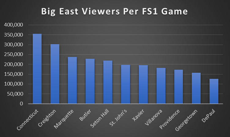 For reference, UConn was in 6 of the top-10 rated FS1 games in Big East play, including the top-3, all over 500K. They had 11 games air on FS1 and averaged 355K viewers a game. In FS1 conference games that didn’t feature UConn, the Big East averaged 184K viewers.