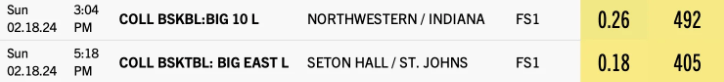 What about Seton Hall vs St. John’s that pulled in 405K on Sunday Feb 18th at 5pm? Wouldn’t you know it, Northwestern and Indiana pulled in 492K in the 3pm slot directly before it. Don’t believe in the correlation? The same matchup between Seton Hall and the Johnnies only garnered 175K on Jan 16, just a month earlier, without a Big Ten game before it.