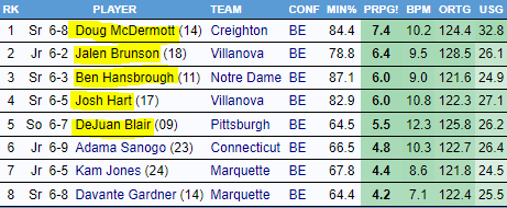 Only 8 Big East players have ever been this efficient on that high a usage over the course of a season. Of those 8, 5 of them won Big East Player of The Year that season, highlighted below. Another, Sanogo, was the Most Outstanding Player of the NCAA Tournament. The other 2 are Marquette snubs that didn’t even make an All-League honorable mention.