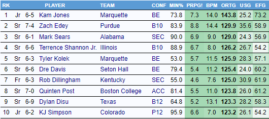 Being able to to put up all-American level offensive efficiency while playing heavy minutes and carrying a big part of the offensive load is not a common feat. The results that populated bear that out.