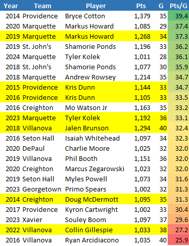 Since the reformation in 2013, only 23 Big East players have hit the 1,000 points-created mark in Synergy’s database. 7 of them have gone on to be named BEPOYs (highlighted). Kolek currently has the 5th best average pts created mark per game.