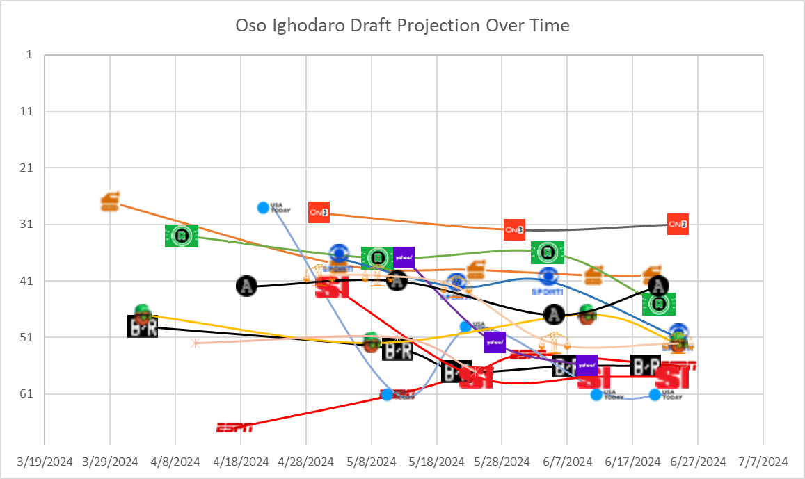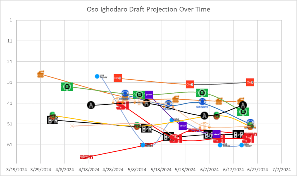Oso’s projections have been quite volatile through the process, with the consensus settling around a mid-to-late 2nd round pick. On3’s projection is the highest on him, putting him a few spots ahead of Kolek at 31, while SI puts him near the end of the draft.