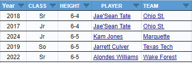 Here’s a list of all the high major players that matched or exceeded Kam’s efficiency at the rim in 2024, via Bart Torvik. Notice that every single comparable player below was at least 6’9″ and also Kam isn’t close to being 6’5″ no matter what Marquette wants to list him at.
