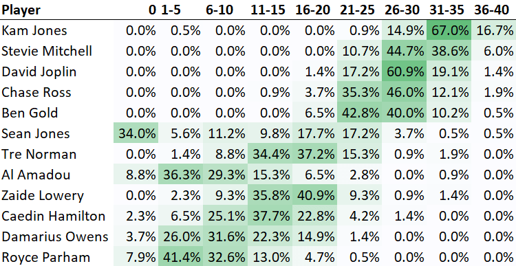 Let’s dive into each player. I’ve bucketed the minute chunks into names and also added the most recent comparison at that minute amount as a barometer for what to expect.