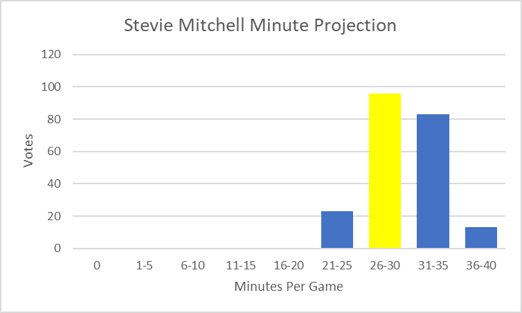 So it’s no surprise that over 83% of respondents projected Kam to get 31+ minutes, the most on the team by a significant margin. He’s averaged 29+ minutes per game both of the past 2 seasons, so taking a small to modest bump seems logical.