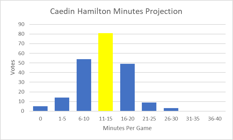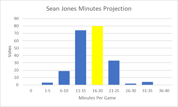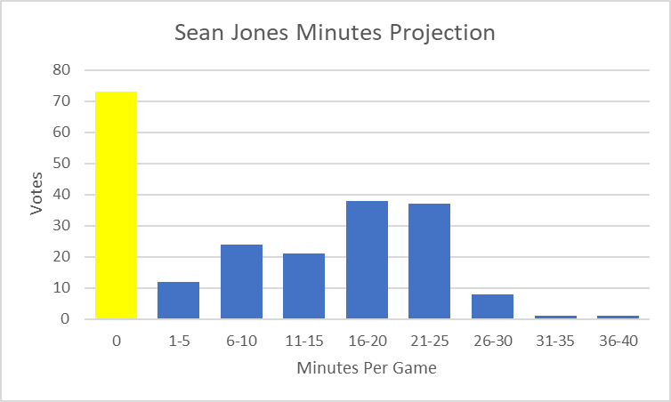 Ben’s vote tally between the first and second most popular responses was the closes of all players, a fact even more incredible when you see that those two buckets composed 82.8% of responses. Ultimately, a majority believes that though Gold will see a bump from his 16.8 minutes last season, it won’t quite be to the 26+ the other 4 projected starters have.