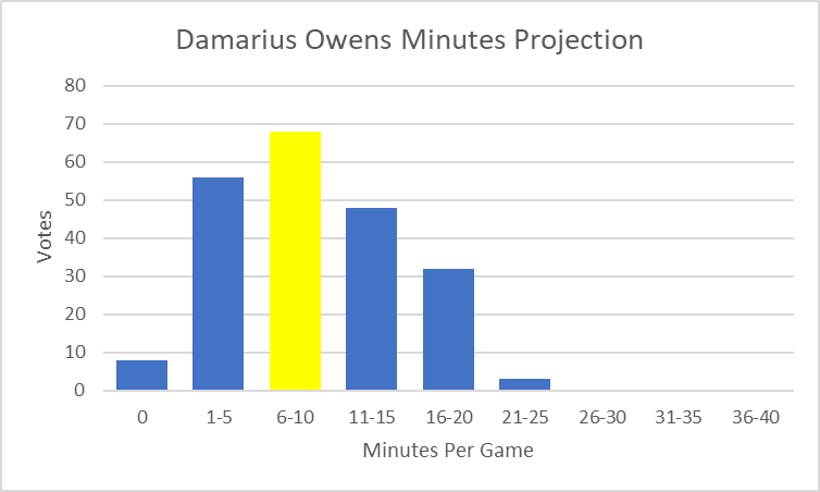 Our first true freshman shows up about where most true freshmen end up, in the deep bench, playing spot minutes irregularly. The consensus has him averaging 6-10 minutes, though not by a landslide or anything. Damarius was the only player to have 30+ votes at 4 different buckets. Which is to say, we’re all guessing.