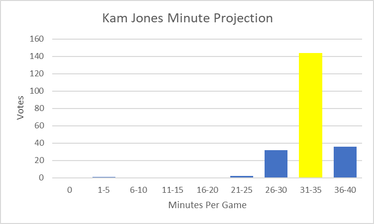 So it’s no surprise that over 83% of respondents projected Kam to get 31+ minutes, the most on the team by a significant margin. He’s averaged 29+ minutes per game both of the past 2 seasons, so taking a small to modest bump seems logical.
