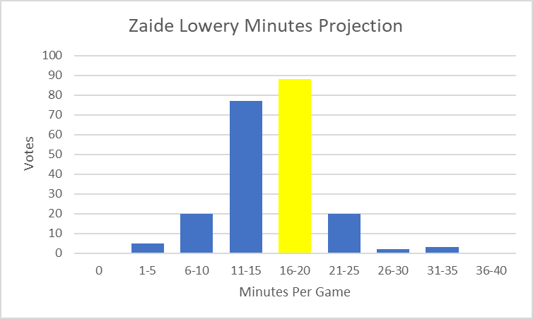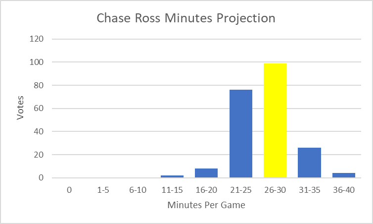 Ben’s vote tally between the first and second most popular responses was the closes of all players, a fact even more incredible when you see that those two buckets composed 82.8% of responses. Ultimately, a majority believes that though Gold will see a bump from his 16.8 minutes last season, it won’t quite be to the 26+ the other 4 projected starters have.