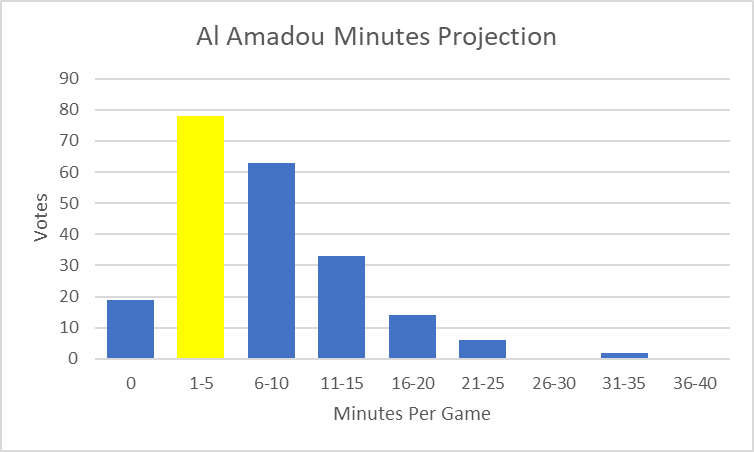 We don’t have a lot of data on Amadou, who only averaged 3.7 minutes in the 14 games he played, but it seems the majority still see him as mostly an end of game type player, closing out cupcakes and blowouts.