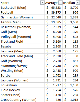 I was a tad surprised to see men’s basketball ahead of football, but then again, this is an average per player, so football’s enormous rosters mean the average gets quite diluted.