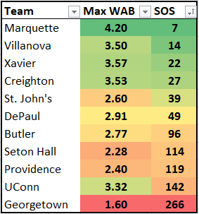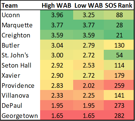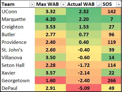 If you want to be uncharitable, and take a worst case scenario, that would then be Marquette, as those WAB points add up to 3.77, a smidge better than Creighton, and .52 better then UConn.