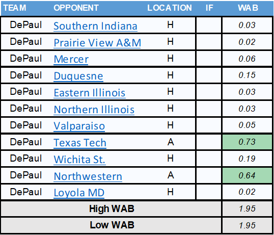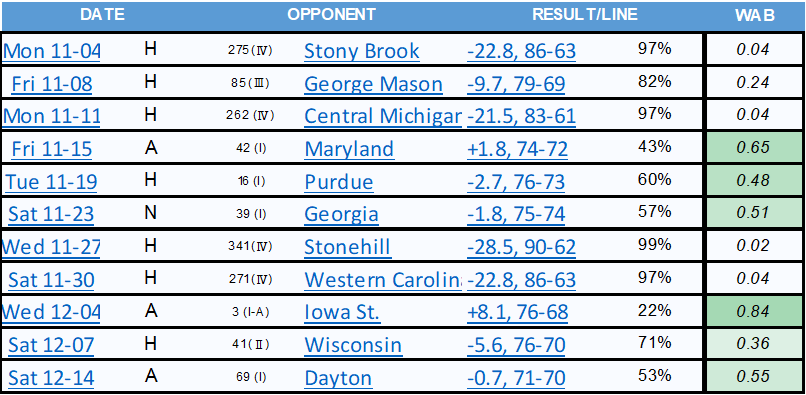 As a participant in the Bad Boy Mowers tournament in Atlantis, the rest of its schedule won’t be known until they actually play Oklahoma on Nov. 27. If they win, they will play the winner of Arizona vs Davidson. If they lose, they will play the loser. Using our WAB metric, we can game out these possibilities and put a hard number on the differences.