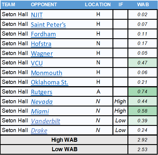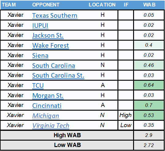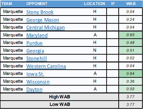 So if Marquette does end up winning that game, it will only earn .04 points, since it’s a given most tournament quality teams will win that game. However, if it does lose, it loses .96 points, as losses truly matter for WAB, not just wins. The penalty for losing to a cupcake is severe.