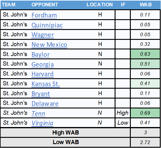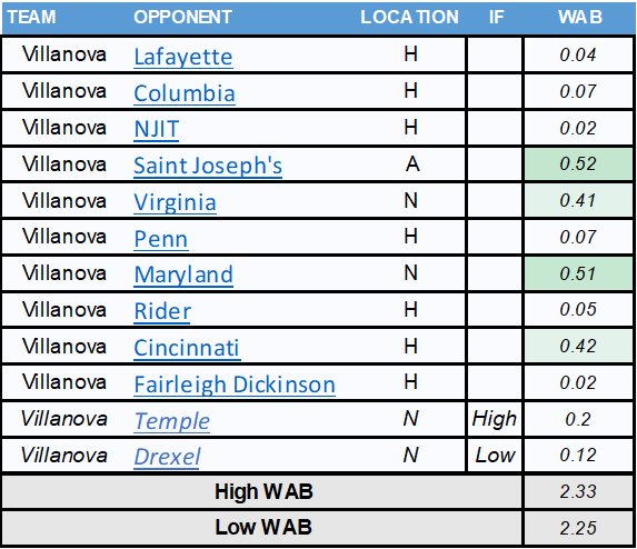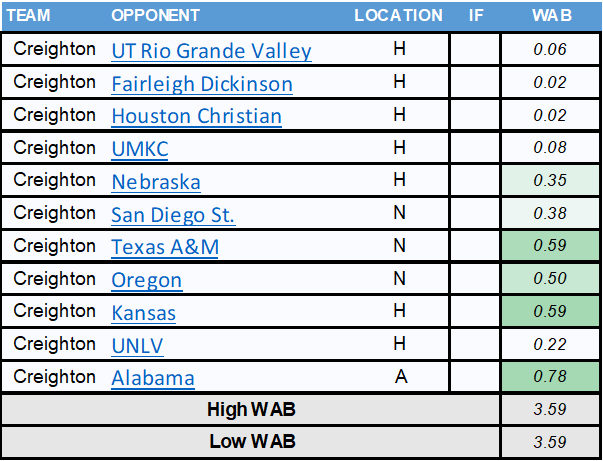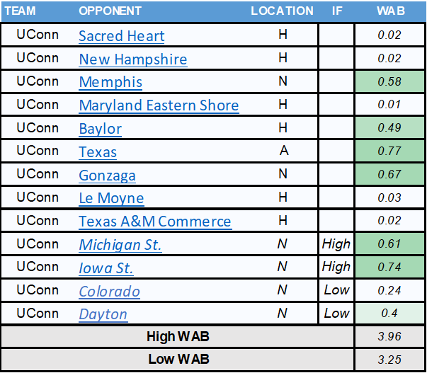 Using best possible opponents (labeled high WAB in the table below) for those in bracketed tournaments, that honor easily goes to UConn, whose WAB sum adds up to 3.96 in Torvik’s projections.