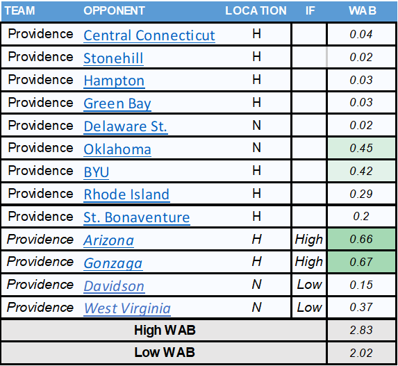 Let’s say the Friars beat the Sooners. They then have a 91% chance, per TRank, of facing Arizona, which is Torvik’s projected No. 10 team in the country. That alone is worth a potential .66 WAB points.