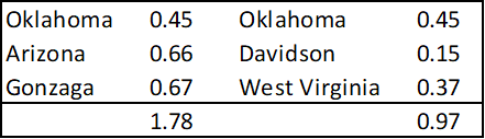Projecting out the final game isn’t as clear cut, as it will depend on multiple games worth of results. but in a best case scenario, Providence would play Gonzaga in the final (worth 0.67). In a worst case scenario, it would play West Virginia in the final game (worth 0.37). Here’s a visual to make it easier to follow.