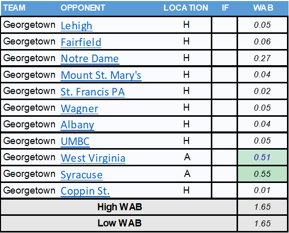 Of course, as we mentioned earlier, these numbers are what the WAB scores would be if a team goes undefeated in the noncon. That’s not going to happen for most teams. So simply having a super difficult schedule based on WAB isn’t necessarily helpful come March.