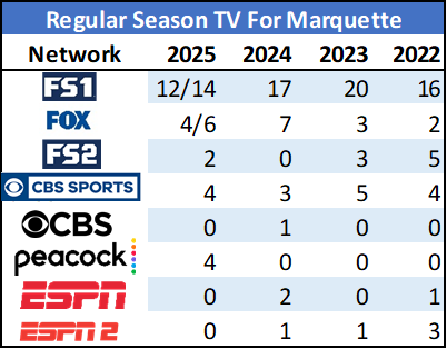 - 2 games are listed as FOX/FS1, so still uncertain, but at most, Marquette will play 14 games on FS1, the fewest in a full season since the reformation