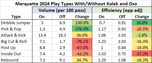 The first thing I noticed was the marked increase in both pick and pops as well as dribble jumpers. When Oso and Kolek were on the court, Marquette averaged 4.6 of those possessions per 100 trips down the floor. With both of them off, Marquette’s attempts went up by 157% to 11.8.