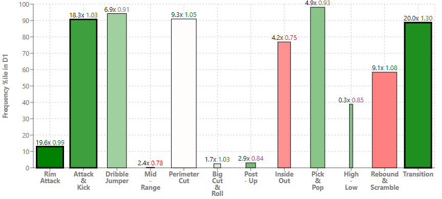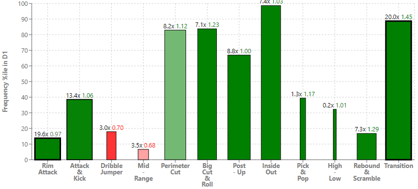 Below we have the 2024 Marquette data with Kolek and Oso on the floor (1592 possessions). For ease of understanding, the height of the chart compares the play type’s usage vs the rest of D1 and the color measures the efficiency. So Marquette was near the 90th percentile with 20 transition play types per 100 possessions, and the dark green indicates the 1.45 points in the paint was among the best in D1. On the other hand, MU took very few dribble jumpers (3.0) and did so at below average efficiency (0.70).