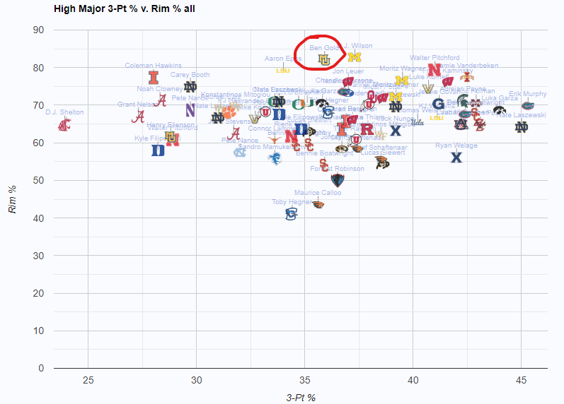 And what we got back was a table with 78 high major, 6-foot-10-or-taller players who had robust volume from behind the arc. Of those 78, none has ever had a higher 3-point rate than Ben Gold’s 78% last season. For those unfamiliar, 3-point rate just divides 3s by all field goal attempts to determine what percent of shots come from distance. And Gold’s 2024 shot distribution is as lopsided as we’ve ever seen for a player of his size.