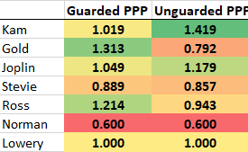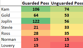 And this isn’t to pick on Ben, either. Looking at the returners, only Kam had a “normal” split between guarded and unguarded efficiency.