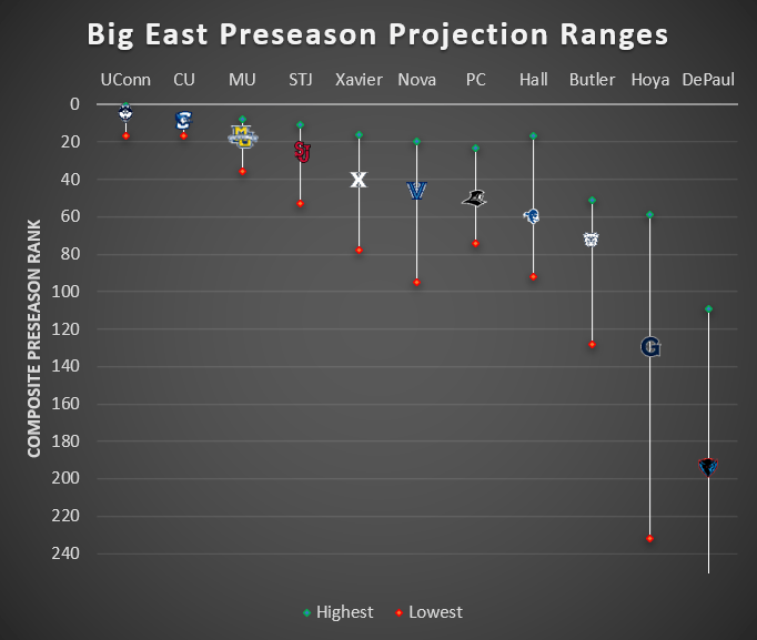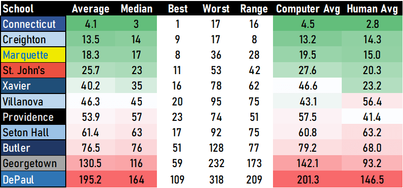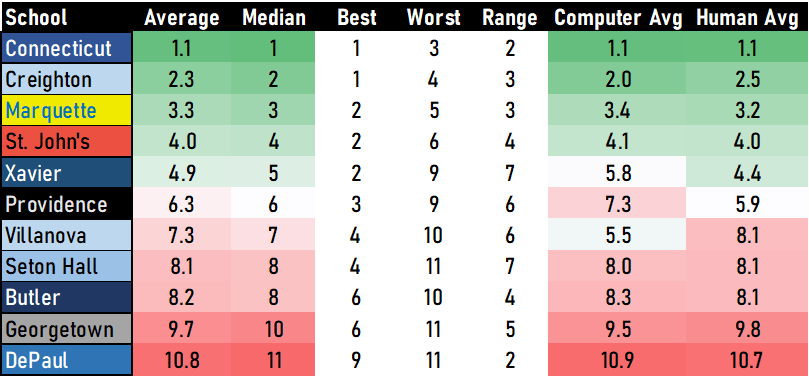And here’s a tidy recap of each team’s projections. Xavier and Seton Hall have the widest range of possibilities, with a range of 7 spots from best to worst.