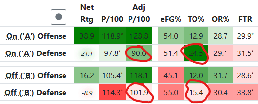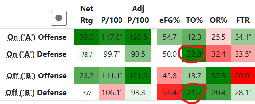 If you break down Hoop-Explorer the stats vs top-100 teams this season, you can see that Marquette’s defense forces turnovers on 24.5% of possessions when Chase is in the game, compared to only 15.4% when he’s off.