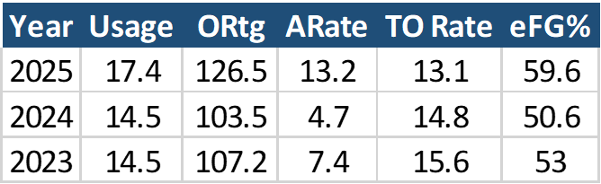 Looking at the year by year Synergy play type splits, Chase has increased his volume while also increasing his efficiency across the top-3 play types, per game (2025 is a the top, 2023 at the bottom).