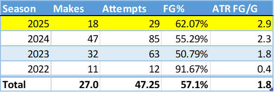 Since then, though, Gold has hit 42.1% of his long-range attempts, and still doing so on 5+ shots a game. I had started tracking it earlier his season, but the chart does a great job illustrating he’s always been a slow starter before settling into a groove.