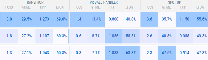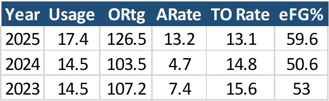Looking at the year by year Synergy play type splits, Chase has increased his volume while also increasing his efficiency across the top-3 play types, per game (2025 is a the top, 2023 at the bottom).
