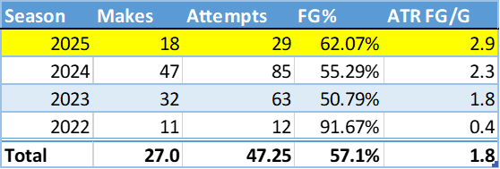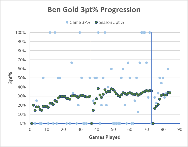 Since then, though, Gold has hit 42.1% of his long-range attempts, and still doing so on 5+ shots a game. I had started tracking it earlier his season, but the chart does a great job illustrating he’s always been a slow starter before settling into a groove.