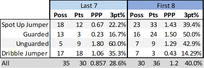 Diving into Synergy, a few peeps on Twitter had wondered what his 3-point shot selection looked like and sure enough, there is a significant jump in the number of dribble jumpers he’s taken. (This is only looking at half-court 3s, so won’t align perfectly with the totals from above.)