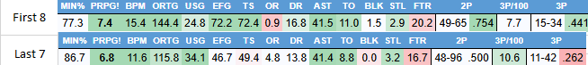 And you don’t have to dig very far to see some of that wear and tear already showing through. Take a look at Kam Jones’ splits from the first 8 games vs the last 7 games of the season. Usage is up by 10(!) points while his ORtg is down by nearly 30(!) points.