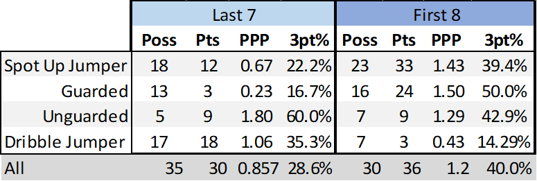 Diving into Synergy, a few peeps on Twitter had wondered what his 3-point shot selection looked like and sure enough, there is a significant jump in the number of dribble jumpers he’s taken. (This is only looking at half-court 3s, so won’t align perfectly with the totals from above.)