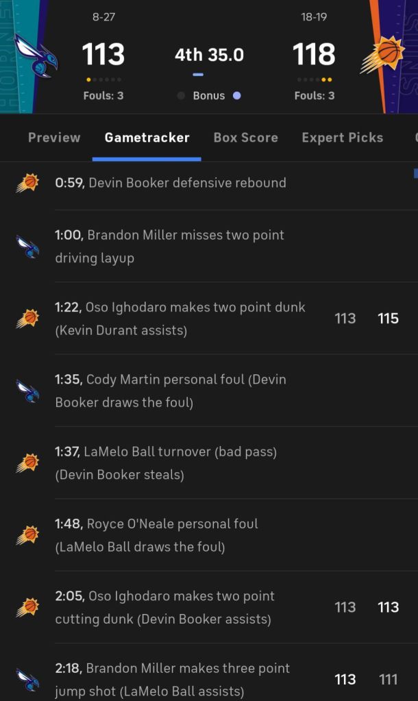 Not only is he seeing an increase in production and minutes, but he is also seeing time on the floor late in close games. On Sunday night the Suns trailed the Charlotte Hornets by a score of 113 to 111 with just over 2 minutes to play in the 4th quarter. On a roster that boasts All Stars Kevin Durant, Devin Booker, and Bradley Beal…it was Oso Ighodaro that knotted the game at 113 and then gave Phoenix the lead for good at 115-113.