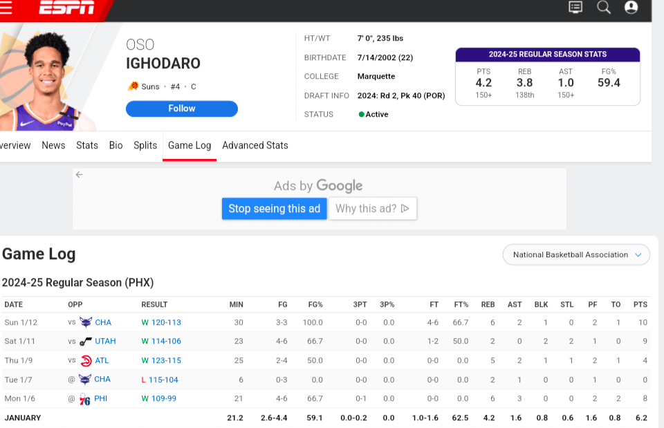 From there, Phoenix would add on one more basket and win by a final of 118 to 113. Oso finished with 10 points (8 in the 4th Quarter), 6 rebounds, 2 assists, and 1 block. This performance helped the Suns win their 4th game in the last 5 contests and get back to .500 with a 19-19 record.